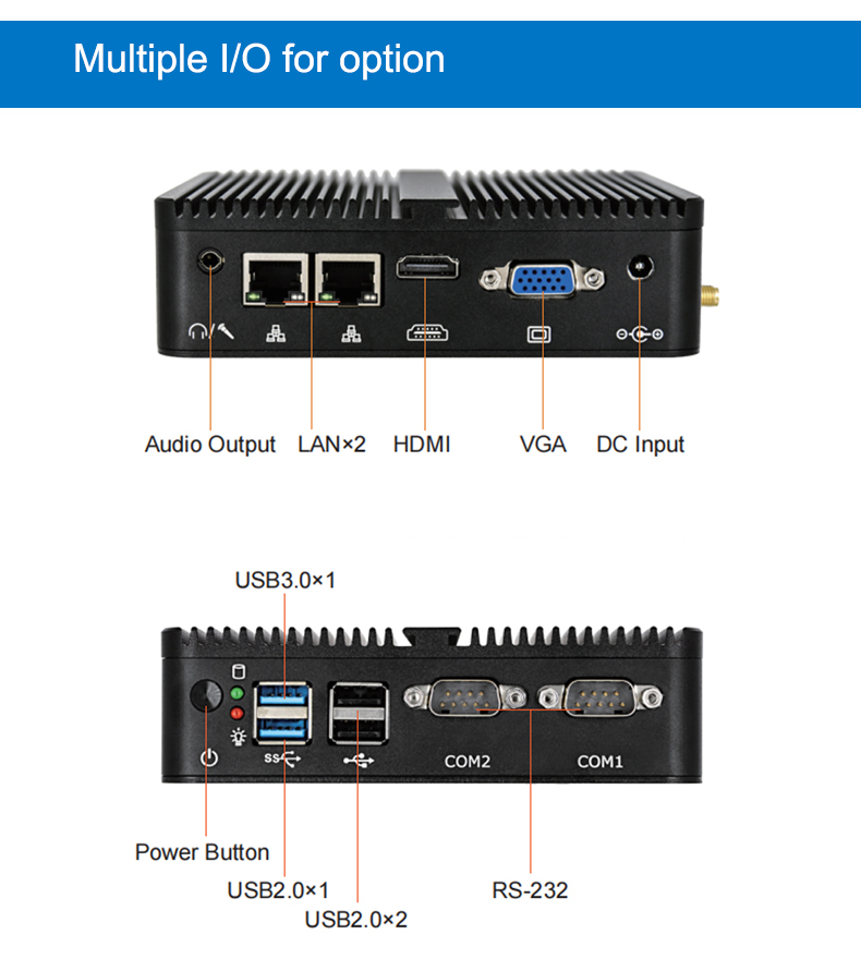 - 3 x USB 2.0 ports, 1 x USB3.0 port,2 x COM ports, 1 x HDMI port, 1 x VGA port, 2 x RJ45 Ethernet ports, 1 x 3.5mm audio output, 1 x 3.5mm microphone jack
