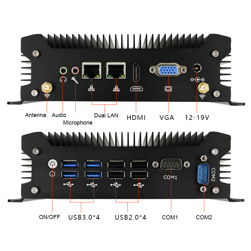 2 x DB9 COM 1 x HDMI,1 x VGA(or HDMI) 1 x Power Button DC 12-19V input 1 x aduio,1 x Min-in 2 x Antenna interface for WIFI/3G/4G |